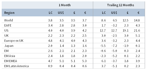 Global risk assets continued their 2019 ascent in April as major US stock market indexes reached new all-time highs. Developed markets stocks, led by strong performance from US and European equities, outperformed emerging markets equivalents. Global growth stocks continued to outperform value and large caps bested small caps after underperforming in first quarter. High yield and investment-grade corporates outperformed global government bonds as credit spreads tightened. Among real assets, commodity futures were mixed and natural resources equities fell; REITs generally declined amid higher global yields. For the major currencies, the US dollar and UK sterling appreciated, while the euro was mixed.