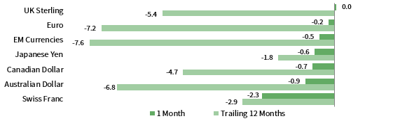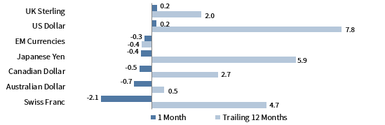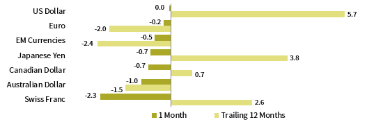 The US dollar gained against all but the UK sterling, appreciating the most versus the Swiss franc and Australian and Canadian dollars. The greenback was broadly stronger over the past year and gained the most against our equal-weighted basket of EM currencies and the euro.