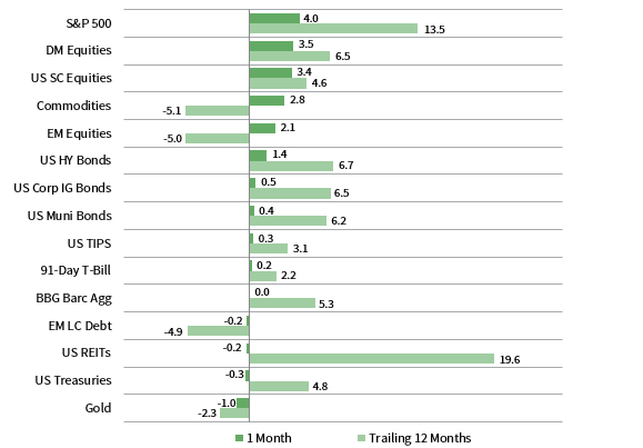 Equities delivered top performance in April. US stocks outperformed global ex US peers and large caps outpaced small caps. Among bonds, high yield and IG corporates performed the best, while US Treasuries and EM LC debt declined. US REITs lagged, but have outperformed over the past year.