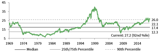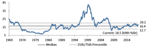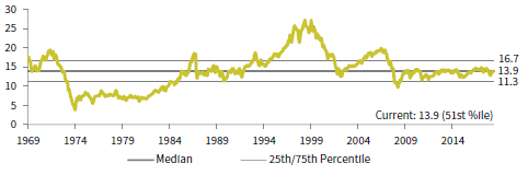 The composite normalized P/E ratio is calculated by dividing the inflation-adjusted index price by the simple average of three normalized earnings metrics: ten-year average real earnings (i.e., Shiller earnings), trend-line earnings, and return on equity–adjusted earnings. We have removed the bubble years 1998–2000 from our mean and standard deviation calculations. All data are monthly.