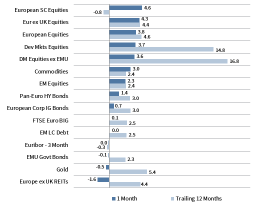 European equities outperformed developed and emerging markets as small caps (the laggard over the past year) posted top returns in April. High-yield and IG corporate bonds outperformed EMU sovereign bonds, which fell slightly. Europe ex UK REITs declined the most, whereas commodities gained on higher oil prices.