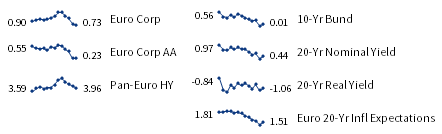European fixed income yields reflect the BofA Merrill Lynch Euro Corporate AA Bond Index, BofA Merrill Lynch Euro Corporate Bond Index, Bloomberg Barclays Pan-European Aggregate High Yield Bond Index, Bloomberg Twenty-Year European Government Bond Index (nominal), ten-year German bund, 20-year European Inflation Swaps (inflation expectations), and the real yield calculated as the difference between the inflation expectation and nominal yield.