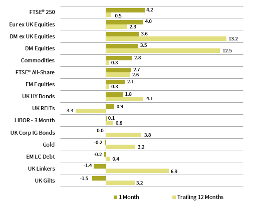 UK mid-cap stocks outperformed broader UK equities, which lagged developed markets counterparts. UK gilts and linkers declined the most in April as hard Brexit fears diminished; high yield and IG corporates outperformed among UK bond sectors. UK REITs advanced but have lagged over the past year.