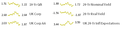 UK sterling fixed income yields reflect the Bank of England 20-year nominal yields, Bloomberg Generic UK 20-year inflation-linked (real) yields, ICE BofAML Sterling Corporate AA Bond Index, ICE BofAML Sterling Corporate Bond Index, and UK ten-year gilts.