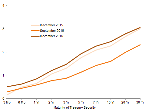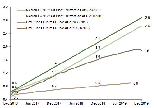 Notes: Data for September 2016 Fed Fund Futures curve available to August 2019. Pricing for September 2019 futures contract as of 10/03/16. Data for December 2016 Fed Fund Futures curve available to November 2019. Pricing for December 2019 futures contract as of 01/03/17.