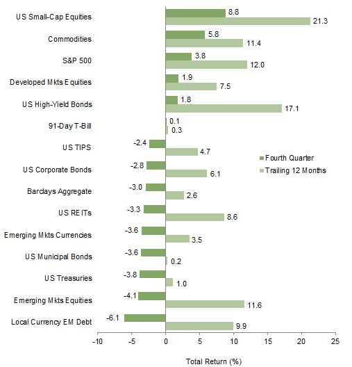 Fourth quarter continued the reflationary trends that began driving global financial markets in July as the outcomes of the US election and OPEC summit in November and the US Federal Reserve meeting in December reinforced the reflation theme. Global government bonds sold off further, with US Treasuries suffering their worst quarter since 1980. Meanwhile, global equities continued to rally, with several developed markets touching their highest levels of the year in December. For the quarter, developed markets equities meaningfully outperformed emerging markets equivalents, which declined. Relative performance of individual equity markets and regions depended on one’s home currency given large currency fluctuations—the US dollar strengthened, while the euro and yen notably weakened. Developed natural resources equities outperformed global stocks as oil and industrial metals prices rallied, leading commodities higher. Gold dropped as higher rates weighed on sentiment; global developed REITs were similarly impacted.