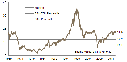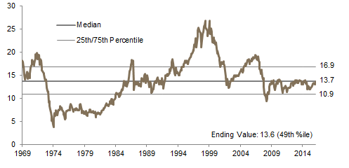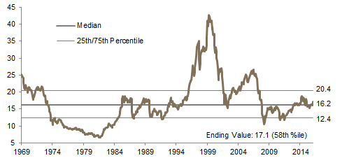 US equities (3.8%) were the third best-performing developed market for the quarter in USD terms as all major US stock indexes touched all-time highs in December. US small caps in particular enjoyed a strong rally following the election of Donald Trump, outperforming large caps by 500 basis points (bps) for the quarter, partly in anticipation of a combination of higher domestic growth and lower taxes, which stand to benefit small caps more. Better financial results announced during the quarter also helped drive US equities higher, as the S&P 500 produced positive year-over-year earnings growth for the first time in over a year. Small-cap results were particularly strong, with Russell® 2000 earnings per share growing almost 8% year-over-year in third quarter. Small-cap value was the best performing market segment in fourth quarter, while mid-cap growth was the worst. Most sectors advanced—exceptions were real estate, health care, and consumer staples. Financials were by far the best performing sector, rallying over 21% in the quarter. Despite improving fundamentals, US equity valuations look increasingly stretched, with US small-cap valuations now just below their highest level since 1978.