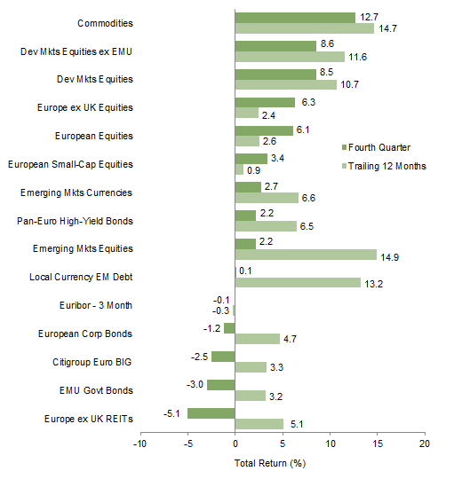 Commodities and developed markets equities outperformed Europe ex UK stocks for the quarter. Pan-euro high-yield bonds and emerging markets equities also advanced, while Eurozone investment-grade bonds and Europe ex UK REITs experienced declines. All major asset categories are in the black for the calendar year, led by emerging markets equities, commodities, and local currency EM debt