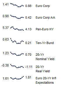 European fixed income yields reflect the BofA Merrill Lynch Euro Corporate AA Bond Index, BofA Merrill Lynch Euro Corporate Bond Index, Barclays Pan-European Aggregate High Yield Bond Index, Bloomberg Twenty-Year European Government Bond Index (nominal), ten-year German bund, 20-year European Inflation Swaps (inflation expectations), and the real yield calculated as the difference between the inflation expectation and nominal yield.