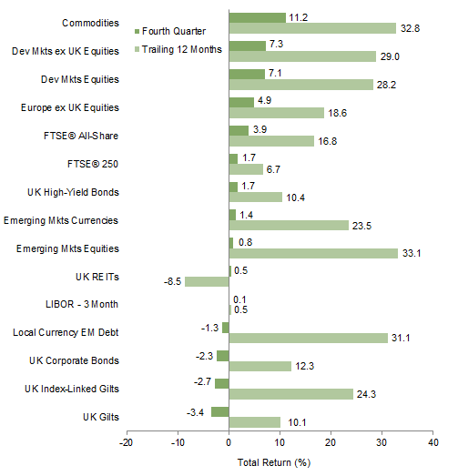 Commodities and developed markets equities enjoyed strong gains for the quarter. UK equities and UK high-yield bonds also advanced, as did emerging markets stocks and UK REITs. UK investment-grade corporate bonds declined, but outperformed linkers and gilts. For the calendar year, UK REITs were the only major asset class to decline, as most enjoyed double-digit gains, led by EM stocks