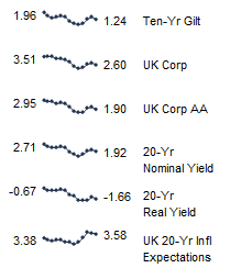 UK sterling fixed income yields reflect the BofA Merrill Lynch Sterling Corporate AA Bond Index, BofA Merrill Lynch Sterling Corporate Bond Index, UK ten-year gilts, and Bank of England 20-year nominal, real, and zero coupon (inflation expectations) yields.
