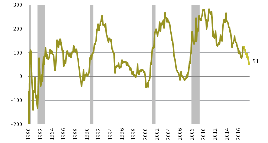 Notes: Shaded areas indicate NBER-defined recessions. Lighter colored line depicts 2017 yield spread. Data are monthly.