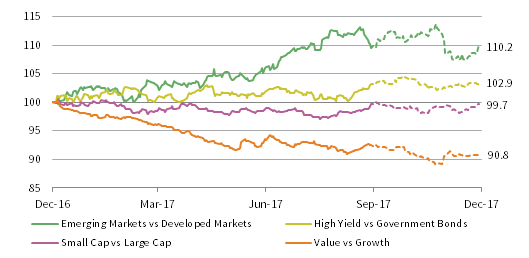Risk assets outperformed in 2017 but relative performance was mixed. EM equities outperformed DM equivalents and high-yield bonds outpaced government counterparts, but small caps were flat relative to large caps and value stocks underperformed growth equivalents for four consecutive quarters.