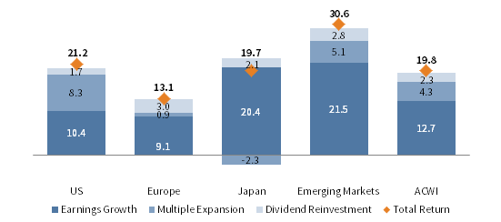 Notes: All returns are in local currency terms. Earnings growth is based on aggregate 12-month forward earnings. Multiple expansion is based on the percent change in 12-month forward price-earnings ratio. Dividend reinvestment is the 12-month total return minus the 12-month price return. All three components of return geometrically compound to total return. Total return data for all MSCI indexes are net of dividend taxes. Total return figure is in bold.