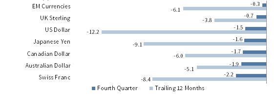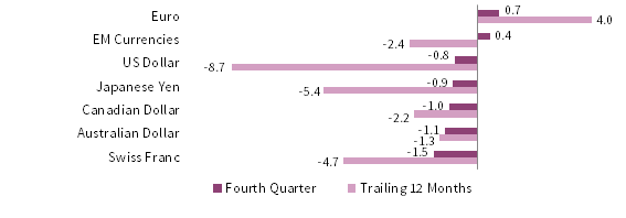After strengthening early in fourth quarter, USD performance was mixed. The US dollar retreated against the euro, our equal-weighted basket of EM currencies, and UK sterling but gained against the Japanese yen, Canadian dollar, Australian dollar, and Swiss franc. Continuing recent trends, the Eurozone’s ongoing economic recovery helped the euro strengthen against all major currencies and our EM currency basket. UK sterling also strengthened against most major currencies as UK and EU negotiators announced progress on Brexit negotiations but weakened against the euro and our basket of EM currencies.