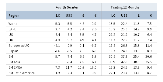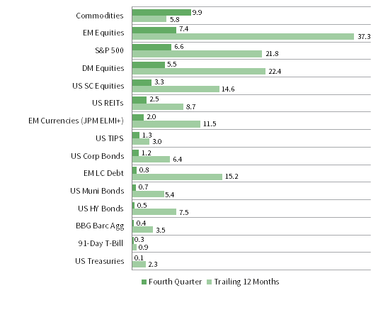 Capital markets performance was mostly positive in fourth quarter, bolstered by strong economic data, solid earnings growth, and market-friendly political and policy developments. Global equities continued their multi-year advance. Emerging markets outperformed developed markets, and growth stocks outgained value stocks in all major currencies for the fourth consecutive quarter. Global government bonds underperformed global equities as yield curves flattened across major economies. Real assets performance was generally positive as commodities, global natural resources equities, and global REITs advanced; only energy MLPs declined. Among currencies, the euro and UK sterling strengthened, while USD performance was mixed.