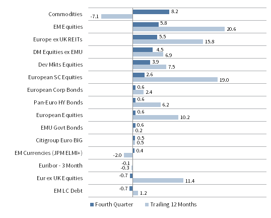 Commodities, , EM equities, and Europe ex UK REITs led gains. European small caps and DM equities outperformed European large caps, whose modest gains were matched by European bonds. EM local currency debt and Europe ex UK equities declined last quarter but gained for the year.
