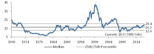 The composite normalized P/E ratio is calculated by dividing the inflation-adjusted index price by the simple average of three normalized earnings metrics: ten-year average real earnings (i.e., Shiller earnings), trend-line earnings, and return on equity–adjusted earnings. We have removed the bubble years 1998–2000 from our mean and standard deviation calculations. All data are monthly.