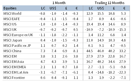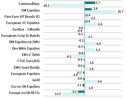 European small-cap equities advanced, while large- and mid-cap equivalents declined. Pan-European high-yield corporate bonds topped corporate investment-grade and EMU government bond equivalents amid rising yields. Gold declined, but remains one of the top performers over the trailing 12-month period.