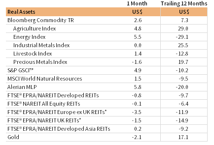 Sources: Alerian, Bloomberg L.P., EPRA, FTSE International Limited, Intercontinental Exchange, Inc., MSCI Inc., National Association of Real Estate Investment Trusts, Standard & Poor’s, and Thomson Reuters Datastream. MSCI data provided “as is” without any express or implied warranties.