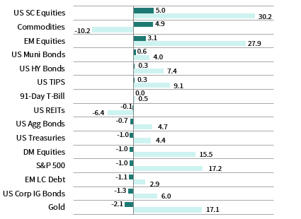 Risk assets broadly outperformed in January, led by US small caps, which outperformed large caps for a fifth consecutive month. Domestic small caps have also been the top-performing asset class over the past 12 months. Emerging markets equities bested developed markets peers and have outperformed by more than 12 ppts over the last year.
