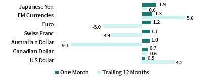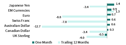 The US dollar broadly appreciated, declining only vis-à-vis UK sterling. The greenback advanced the most versus the Japanese yen, our equal-weighted basket of emerging markets currencies, and the euro. Over the past 12 months, the US dollar has weakened significantly, particularly versus the Australian dollar, euro, and Swiss franc.