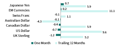 UK sterling advanced in January, appreciating the most vis-à-vis the Japanese yen, our equal-weighted basket of EM currencies, and the euro. Pound sterling was mixed over the past 12 months, declining versus the Australian dollar, euro, and Swiss franc, and gaining the most against emerging markets currencies and the US dollar.