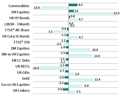 Risk assets broadly outperformed in January. Commodities were the top-performing asset class, boosted by energy and agriculture, but remain deeply negative over the past 12 months. Emerging markets equities were another top performer and have bested all asset classes over the last year, including developed market equivalents. In contrast, UK linkers and Europe ex UK equities lagged the most.