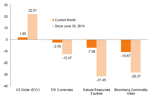 Notes: The DXY Index measures the value of the US dollar relative to a basket of other developed markets currencies. Emerging markets currencies are measured by the J.P. Morgan ELMI+ Index and natural resources equities are measured by the MSCI World Natural Resources Index.