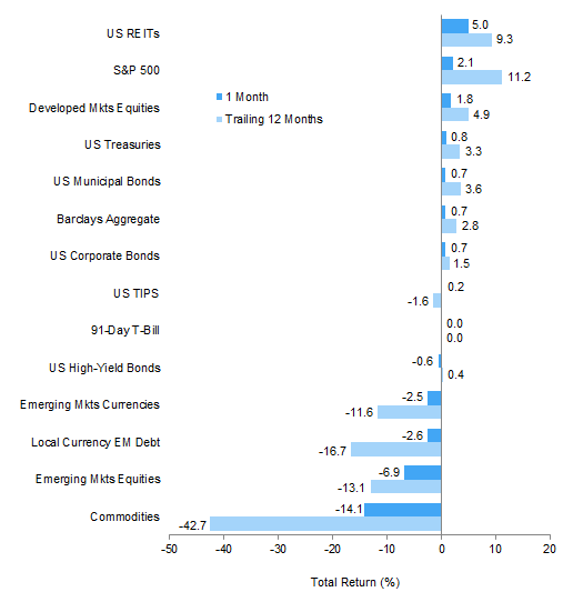 Inflation-sensitive assets experienced a volatile month with divergent outcomes. The combination of renewed dollar strength, record production, and heightened fears regarding China’s growth outlook suggest supply/demand imbalances will persist. Commodities (-10.6% based on the Bloomberg Commodity Total Return Index) sold off across the complex, and spot prices fell to lows last seen during the global financial crisis, led by falling energy and metals prices. The prices of WTI and Brent dropped below $50 and $55, respectively, giving back all of their second quarter gains. Gold prices (-6.4%) also participated in the downdraft as investors anticipated higher interest rates and demand proved nonexistent. Natural resources equities (-6.2%) suffered in sympathy, with weak results from global integrated firms setting the tone. Energy MLPs (-3.2%) also declined amid indications some may need to reduce distribution payments. US REITs (5.0%) proved more resilient as recent losses (and lower Treasury yields) enhanced the optical appeal of their yields.