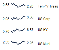 US fixed income yields reflect Barclays Municipal Bond Index, Barclays US Corporate High Yield Bond Index, Barclays US Corporate Investment-Grade Bond Index, and the ten-year Treasury.
