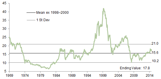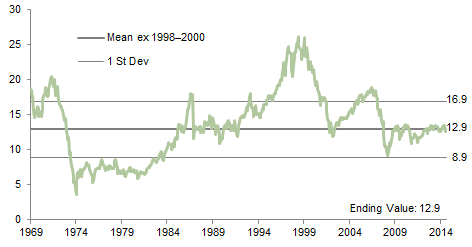 The composite normalized P/E ratio is calculated by dividing the inflation-adjusted index price by the simple average of three normalized earnings metrics: ten-year average real earnings (i.e., Shiller earnings), trend-line earnings, and return on equity–adjusted earnings. We have removed the bubble years 1998–2000 from our mean and standard deviation calculations. All data are monthly.