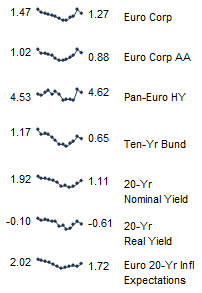 European fixed income yields reflect the BofA Merrill Lynch Euro Corporate AA Bond Index, BofA Merrill Lynch Euro Corporate Bond Index, Barclays Pan-European Aggregate High Yield Bond Index, Bloomberg Twenty-Year European Government Bond Index (nominal), ten-year German bund, twenty-year European Inflation Swaps (inflation expectations), and the real yield calculated as the difference between the inflation expectation and nominal yield.