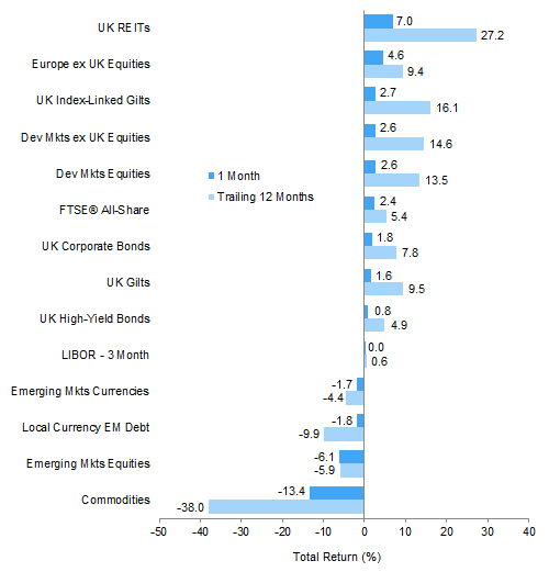 UK investors saw international developed markets stocks and bonds generally outperform local equivalents on the back of pound weakness. UK investment-grade bonds recovered some of their second quarter losses. Commodities and related assets suffered