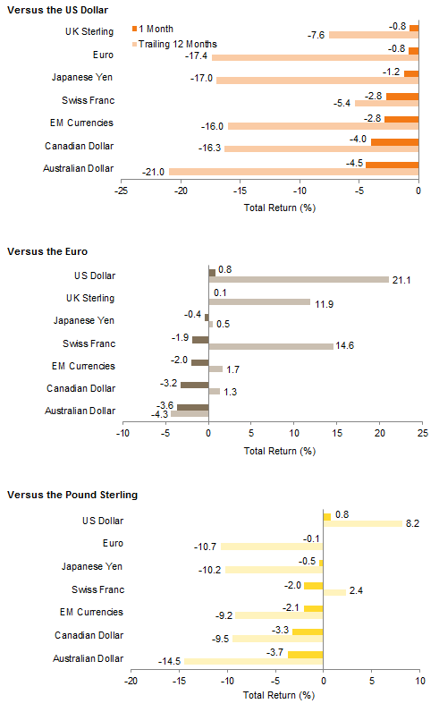 July saw the dollar resume its march higher after experiencing a soft patch in the second quarter. Currencies of emerging and developed markets commodity exporters proved particularly vulnerable to renewed dollar strength