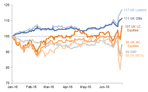 Notes: Data are daily. Performance reflects total returns, except for GBP, which is the change in trade-weighted exchange rate, represented by the Bank of England Pound Sterling Effective Exchange Rate Index. UK Large Cap equities are represented by the FTSE® 100 Index; UK Mid Cap equities, the FTSE® 250 Index; UK gilts, the FTSE® British Government All Stocks Bond Index; UK linkers, Barclays UK Gilts Inflation Linked Index; and UK REITs, the FTSE® All-Share Real Estate Investment Trust Index.