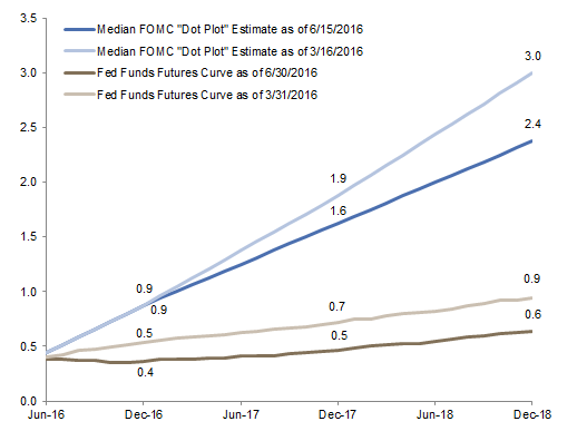 The disappointing May jobs report and concerns regarding the looming UK referendum likely contributed to the Fed’s decision to remain on hold at its June 14 policy meeting. FOMC members downgraded their expectations for the future path of interest rates but still guided toward two hikes in 2016, while the futures markets has now priced out any rate increase this year