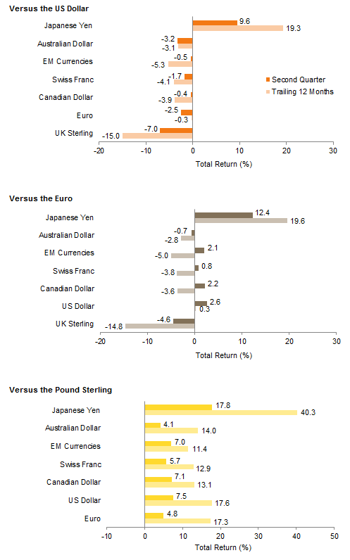 Investors sought refuge in the US dollar and, particularly, the Japanese yen after the UK referendum result. The greenback finished the quarter having appreciated on a trade-weighted basis, with the British pound and the Mexican peso the weakest performers vs the dollar