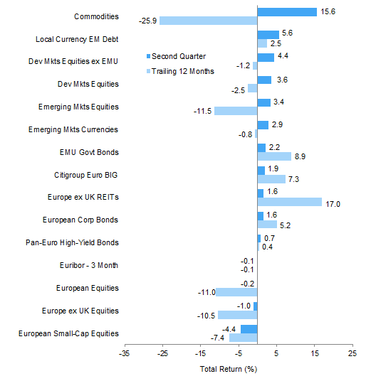 Commodity futures, foreign bonds, and international equities outperformed European assets in euro terms in second quarter. European bonds and REITs enjoyed positive returns and outperformed European equities, which suffered declines and are among the worst performers over the last 12 months, along with emerging markets equities and commodities