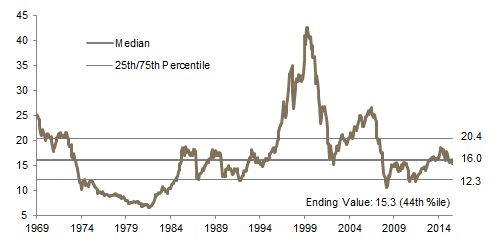 Europe ex UK (-1.1%), EMU (-2.9%), and Japanese (-7.8%) equities underperformed for the quarter. Financials and consumer discretionary stocks were particularly hard hit. Eurozone and Japanese banks sold off, with many now trading at just about half of book value amid concerns that negative rates are here to stay and could go even lower, despite a growing consensus that they have been largely ineffective at stimulating demand. As a result, valuations for Eurozone and Japanese equities overall now sit at extremely low levels relative to US equivalents.
