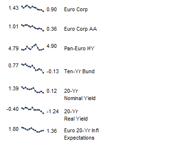European fixed income yields reflect the BofA Merrill Lynch Euro Corporate AA Bond Index, BofA Merrill Lynch Euro Corporate Bond Index, Barclays Pan-European Aggregate High Yield Bond Index, Bloomberg Twenty-Year European Government Bond Index (nominal), ten-year German bund, 20-year European Inflation Swaps (inflation expectations), and the real yield calculated as the difference between the inflation expectation and nominal yield.