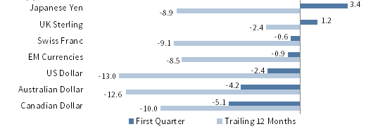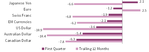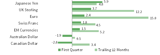 Among major currencies, UK sterling, the euro, and the Japanese yen appreciated in first quarter while the US dollar was generally weaker. The US dollar depreciated the most against the Japanese yen, UK sterling, and the euro, but gained against the Australian and Canadian dollars. The greenback was weaker in the trailing 12-month period versus every major currency we cover, including our equal-weighted emerging markets basket. The euro appreciated most in first quarter against the Canadian dollar, Australian dollar, and US dollar, but declined relative to the Japanese yen and UK sterling. Over the past year, the euro strengthened broadly. In first quarter, the UK sterling gained against all but the Japanese yen, and appreciated more than 3% against the Canadian dollar, Australian dollar, and US dollar. The sterling gained against all but the euro over the trailing 12 months.