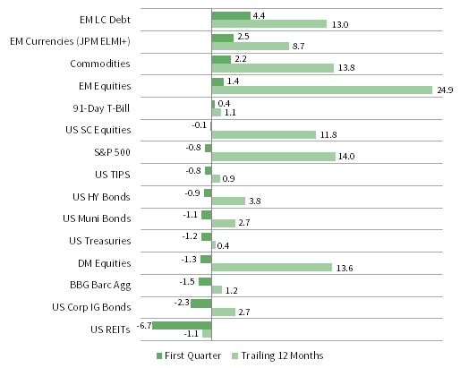 US assets fell broadly in first quarter as higher US Treasury yields hit US REITs, US investment-grade bonds, and DM equities the hardest. EM assets and commodities gained with the help of ongoing US dollar weakness, while US T-bills also advanced. Global risk assets performed strongly the past year