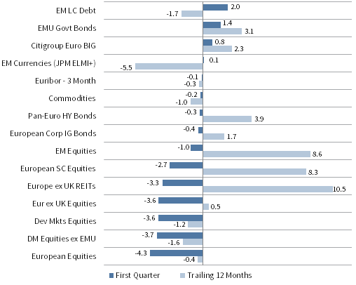Euro index performance chart includes performance for the Bloomberg Barclays Euro-Aggregate: Corporate, Bloomberg Barclays Pan-Euro High Yield, Citigroup EMU Govt Bonds, Citigroup Euro Broad Investment-Grade Bonds, Euribor 3-month, FTSE® EPRA/NAREIT Europe ex UK, J.P. Morgan ELMI+, J.P. Morgan GBI-EM Global Diversified, MSCI Emerging Markets, MSCI Europe, MSCI Europe ex UK, MSCI Europe Small-Cap, MSCI World ex EMU, MSCI World, and S&P GSCI™ indexes.