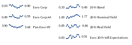 European fixed income yields reflect the BofA Merrill Lynch Euro Corporate AA Bond Index, BofA Merrill Lynch Euro Corporate Bond Index, Bloomberg Barclays Pan-European Aggregate High Yield Bond Index, Bloomberg Twenty-Year European Government Bond Index (nominal), ten-year German bund, 20-year European Inflation Swaps (inflation expectations), and the real yield calculated as the difference between the inflation expectation and nominal yield.