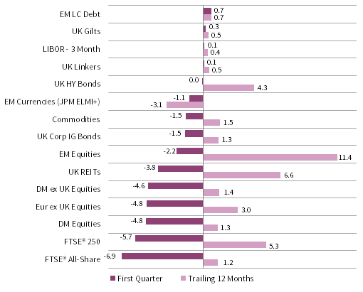 Global equities declined as UK equities underperformed DM counterparts, while EM equities continued to outperform. UK gilts and linkers eked out slight gains, while UK high-yield bonds were flat and UK corporate IG bonds declined. Over the past year, EM equities, UK REITs, and UK mid caps have gained the most