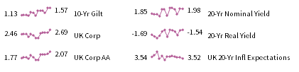 UK sterling fixed income yields reflect the BofA Merrill Lynch Sterling Corporate AA Bond Index, BofA Merrill Lynch Sterling Corporate Bond Index, UK ten-year gilts, Bank of England 20-year nominal yields, and Bloomberg Generic UK 20-year inflation-linked (real) yields. Current UK 20-yr nominal yield data are as of March 27, 2018.