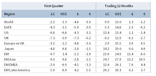 Risk assets in first quarter failed to sustain January’s surge as prospects for rising inflation, higher bond yields, increasing trade protectionism, and tighter technology regulations weighed on sentiment during February and March. Global equity performance was generally weak, although emerging markets equities eked out modest gains in USD terms and continued to outperform developed markets equivalents, which declined. US Treasuries were no safe haven as yields rose and performance was in the red, however non-US government bonds offered some protection as their yields were more stable. Corporate bonds underperformed sovereign counterparts as credit spreads widened amid heightened economic uncertainty and equity volatility. Rising bond yields also pressured developed REITs as real assets mostly declined. Energy MLPs and natural resources equities fell sharply despite higher energy prices, while returns for commodities were more mixed. The US dollar continued to weaken, while the euro and UK sterling broadly appreciated.