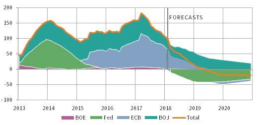 Notes: Central bank asset purchases are 12-month moving averages. Central bank asset purchases data after February 28, 2018, are estimates based on central bank announcements and J.P. Morgan projections.