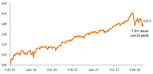Global equities enjoyed a historically low volatility climb from their February 2016 low to an all-time peak in late January, a 51% gain. They have since corrected 8% amid threats from rising inflation and bond yields, worsening trade tensions, and rising political and regulatory pressure on leading tech companies